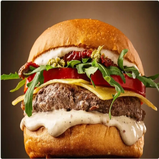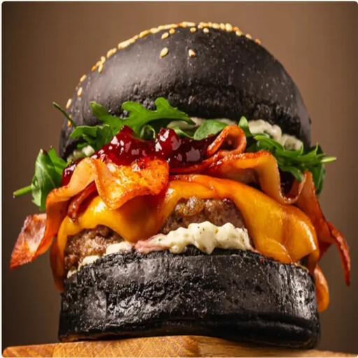 Сочный контраст мраморной котлеты и жареного бекона, слайса чеддера, рукколы, с соусами «Брусничный чатни» и «Ранч» на чёрной бриоши.